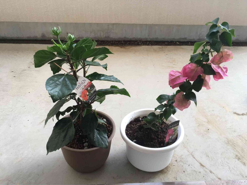本日、ハイビスカスとブーゲンビレアを迎えました。とうにパンジーが枯れたプランターに植えるものを探しに行ったはずが。
