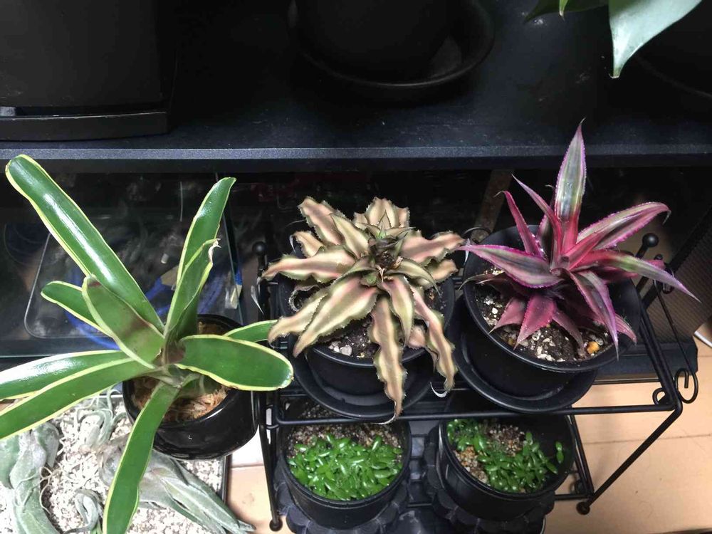 左からネオレゲニア、クリプタンサス2種。ネオレゲニアは水苔に、クリプタンサスは土植えに。