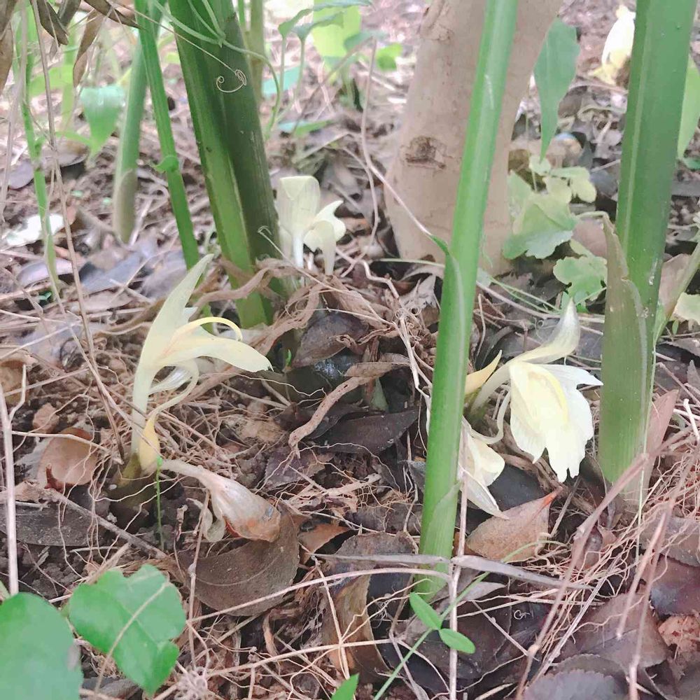 茗荷の花🌼初めて見ました。地面から直に咲くとは、ビックリ😵
