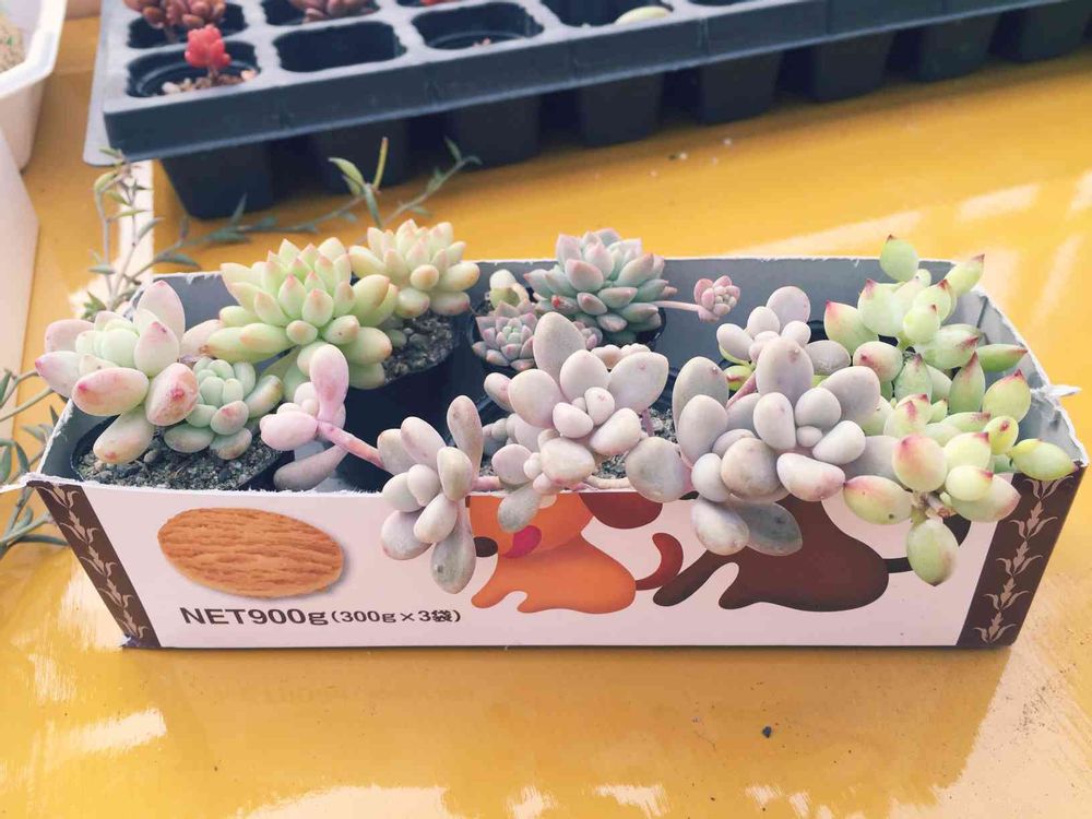 ワンダーガーデンに行ったらカット苗売り切れでガックリ来て他の物に目が行かず🙄ロウルサンコさんでチビ達を狩りました😅入れてくれた箱が可愛い( ́•ૢ⌔•ૢ ̀)