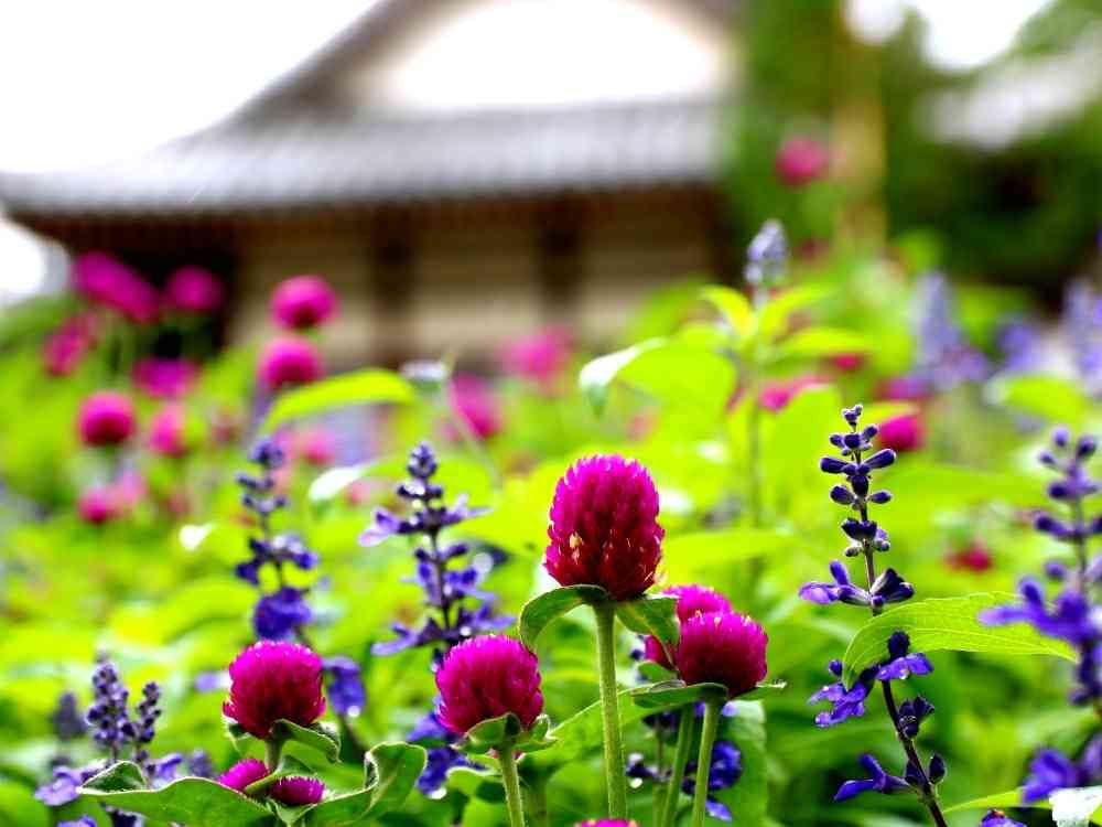 千日紅とブルーサルビア越しのお寺?の景観が良いですね