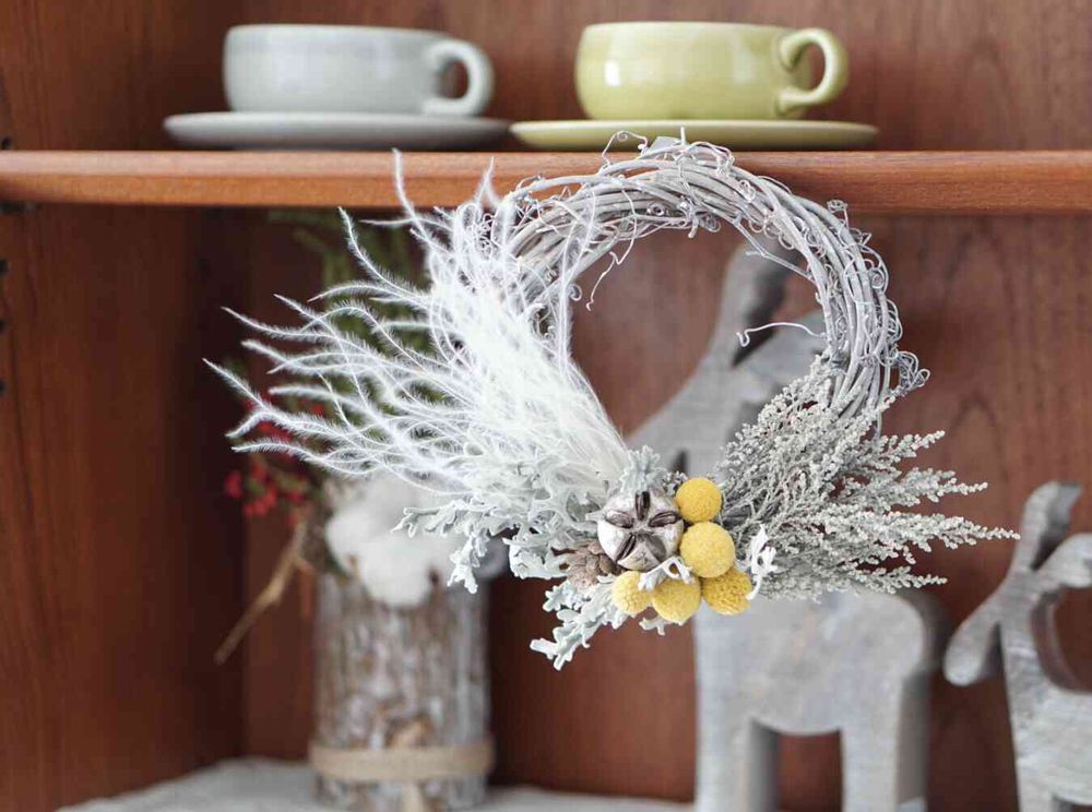 グレーベースのリース。色味のない世界にしようと思ったけれど少し寂しかったので黄色のビリーボタンで色づけ♡