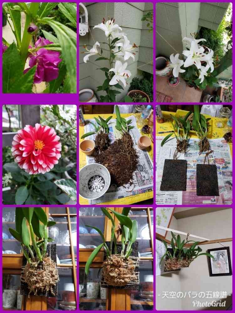 帰宅後は、すぐに園芸をはじめ、庭仕事は水やりと剪定、花がら摘み、それが終わると、午後8時半から10時半までが、家の中で、フェゴ着生ボードへカトレアを一つの鉢を2つに分けて張り付け、その後はデンドロビウム・ギンギアナムのビニールポットを素鉢へ植え替えをしました。