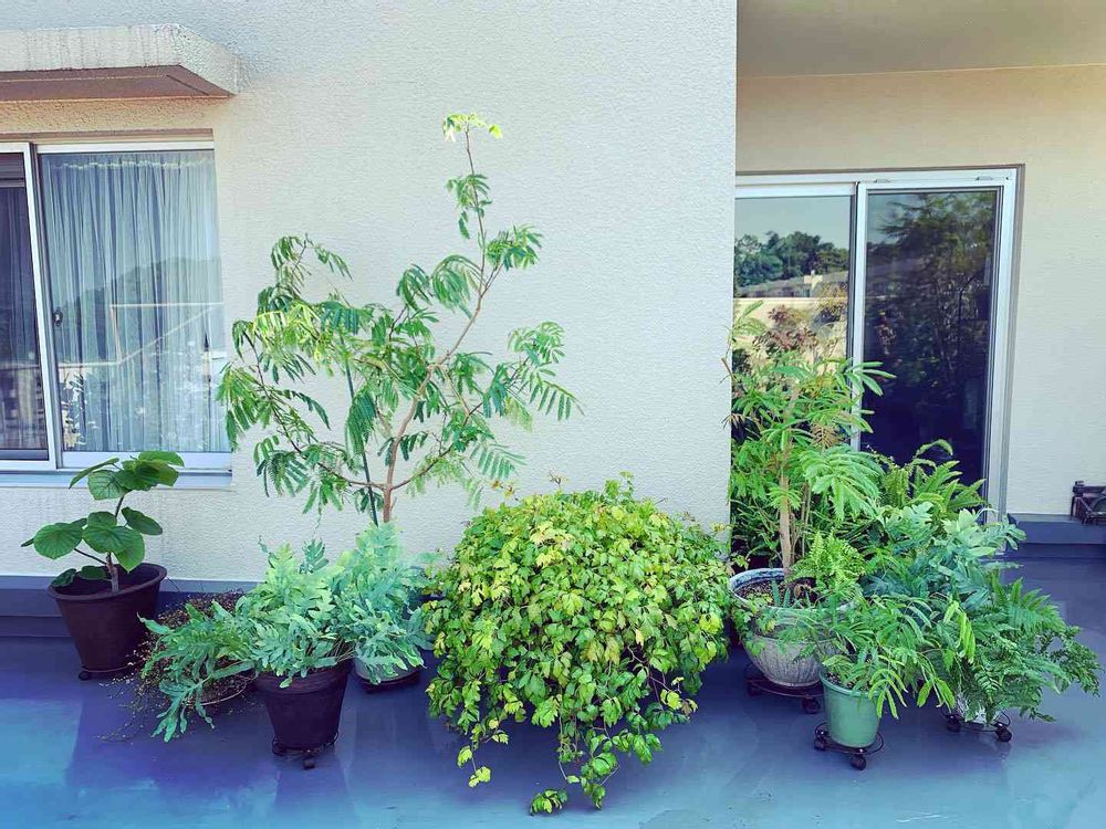5月頃からふと閃いて…室内の観葉植物達の生命力を引き出せやしないかと、実験的にテラスの半日陰の場所に出してみることにしました。