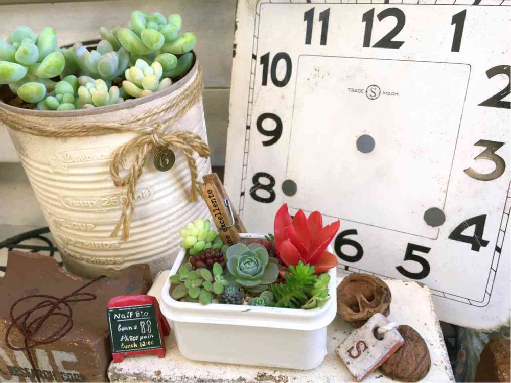 ペンキを塗り重ねてお弁当箱に見立てた容器に、多肉の寄せ植えをしました😊💕