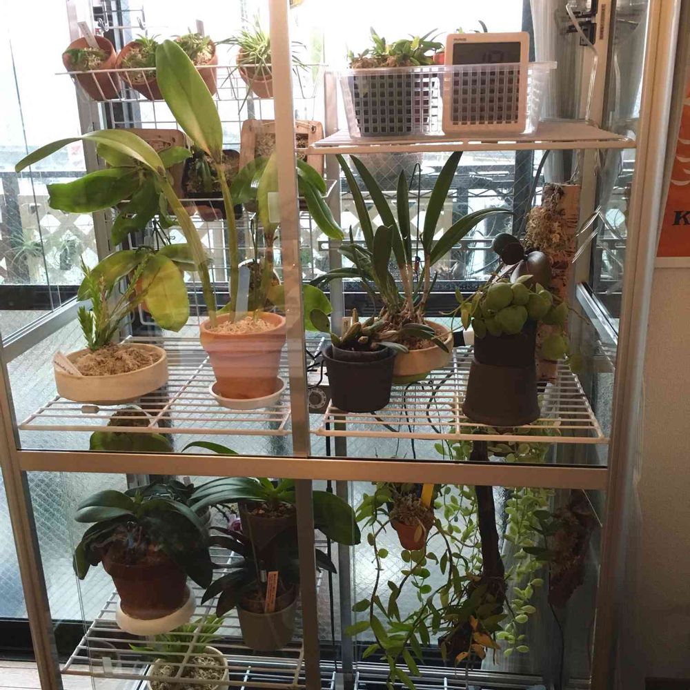 クララんと同じ風蘭とノビル系デンドロはこの中に居ないよー。ココは高温好き組がほとんど。あと、養生株。チラも入ってない。キセロさん、試しに入れたら、キセロさん2個で終わった笑