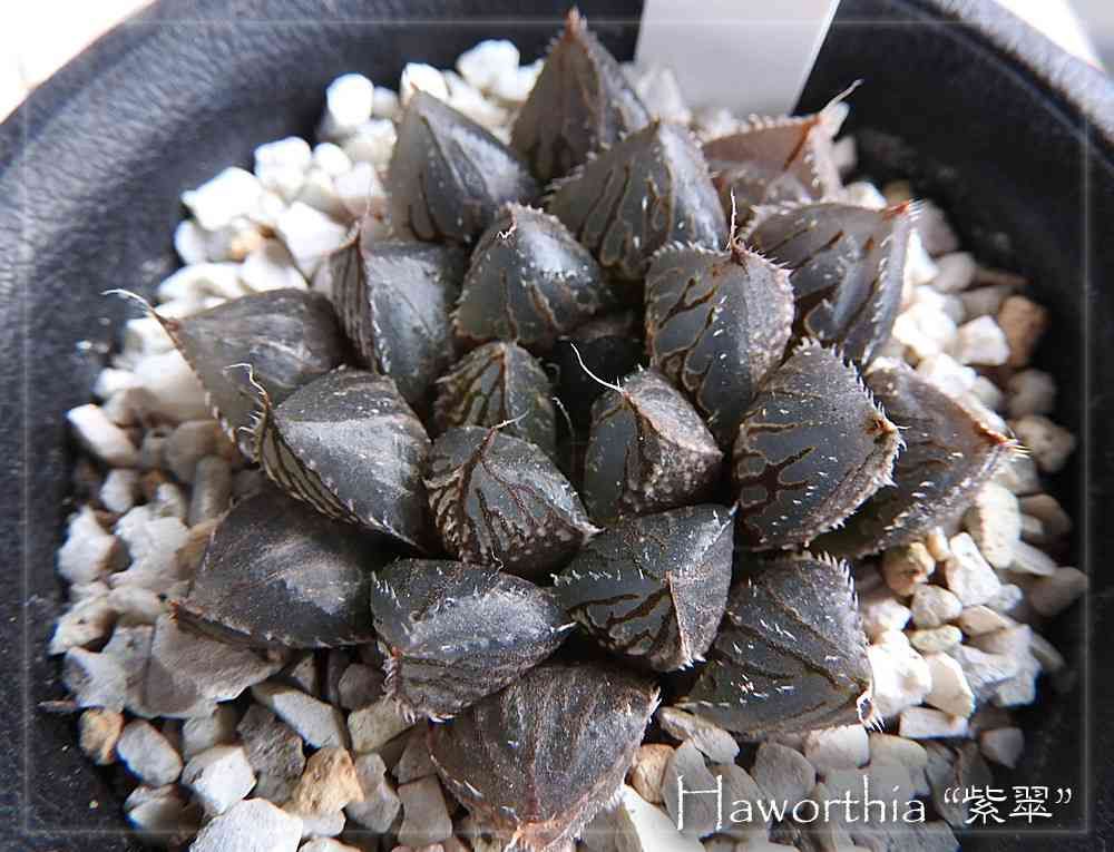 ハオルチア、紫翠。ただし、この名前で検索すると、硬葉系ハオルチアがヒットするので、札は付いているけど正体不明。ミラーボールに似てるような気もするけど、成長が遅くて平べったく成長する様子が違うかな……。葉がしわくむと一気に株全体が小さくなるので、季節によって見かけが全然違ってしまう。