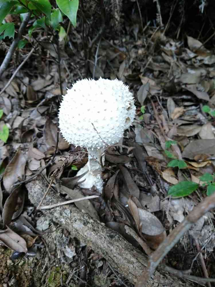 先ほどのすぐ近くに違う白いキノコさん、丸くて、トゲトゲみたいな見た目、直径5、6㎝くらい😃初めて見ました❗