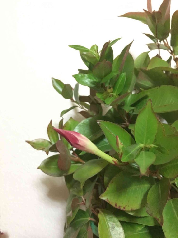 ベランダから引避難してきたマンデビラさんですが冬は咲かないだろうと思い、緑を楽しんでましたが。。。蕾発見!👀✨さらによく見たら新芽があちこちから出てる♪