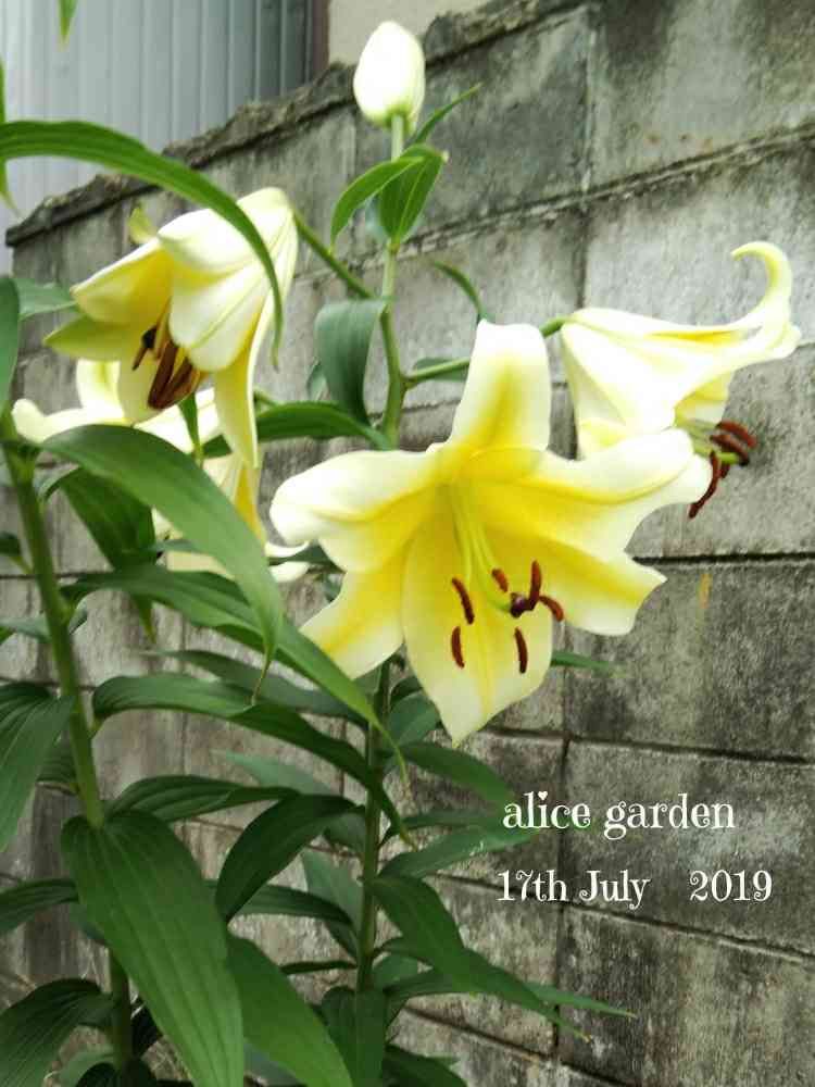 咲き進んで、今は純白のカラブランカと咲きたての黄色のカサブランカの共演です。