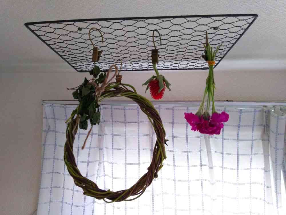セリア300円(ワイヤーネット、カーテンクリップ、画鋲)+テグスでドライフラワーコーナー出来た!