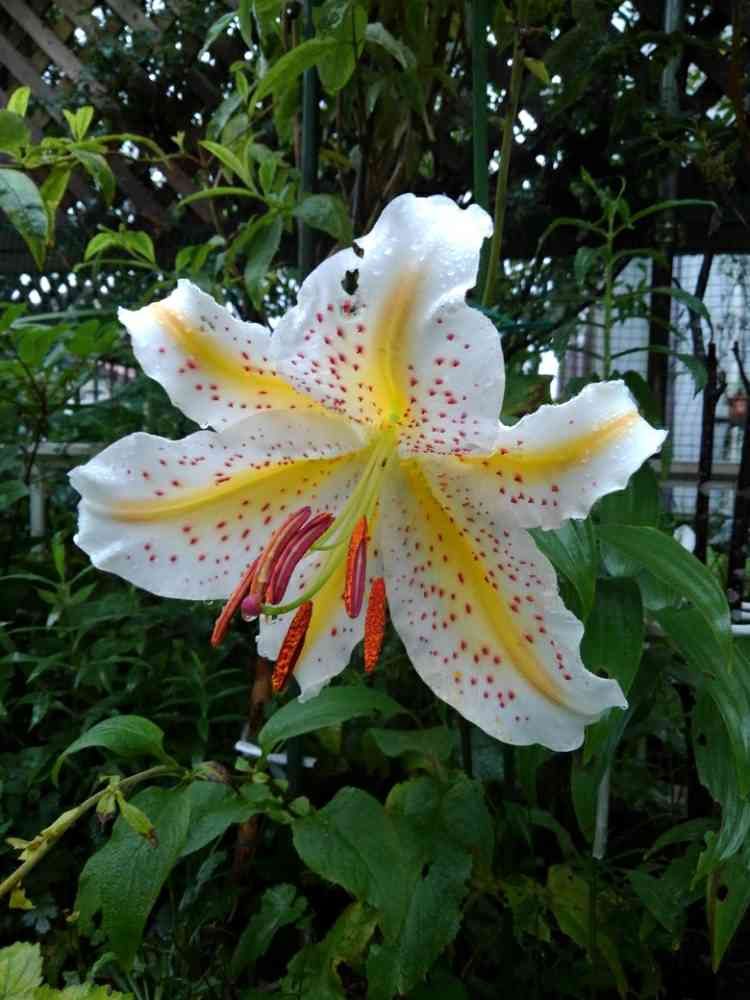 今日も曇り空になりそう😐 山百合が咲きました😄♥️ 1個だけだけど、もうなくなったのかと思っていたので嬉しい🎵😍🎵 狭い庭にすごい存在感🎶 香りが良いですね😄❗😄