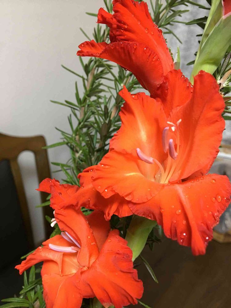 夜中の雨で、グラジオラスが横倒しになってました。二本同じ色を切花にしました。蕾の時は明るい赤でしたが咲いたら朱色に近い和のイメージの色合いでした。