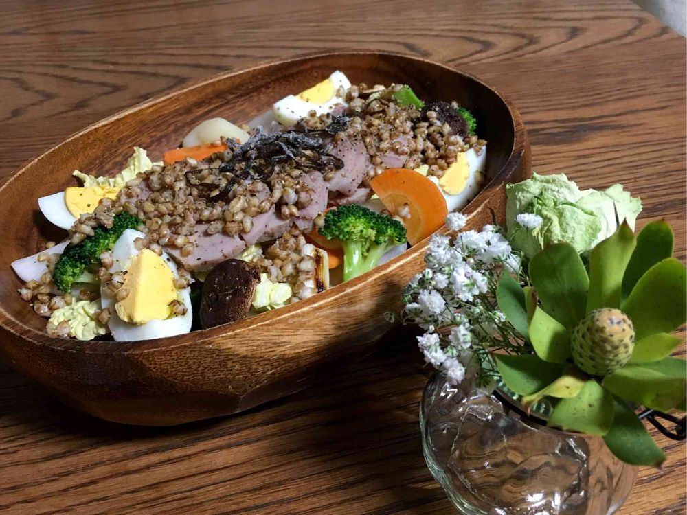 ロースハムを作ったのでたっぷりな野菜ともち麦も加えて