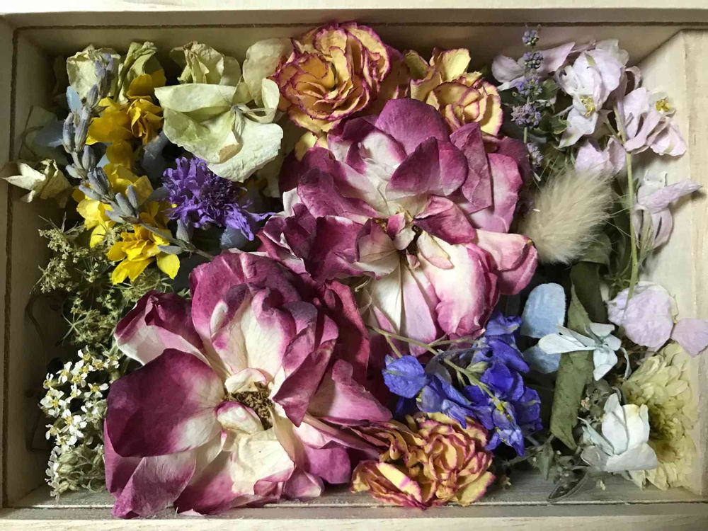 たぶん売られているのはブリザードフラワーで、お花もキレイに並べて固定されていると思うのですが、これは自家製ドライフラワーで作ったので、下にはタイムなどを敷き詰めて高さを出しました。