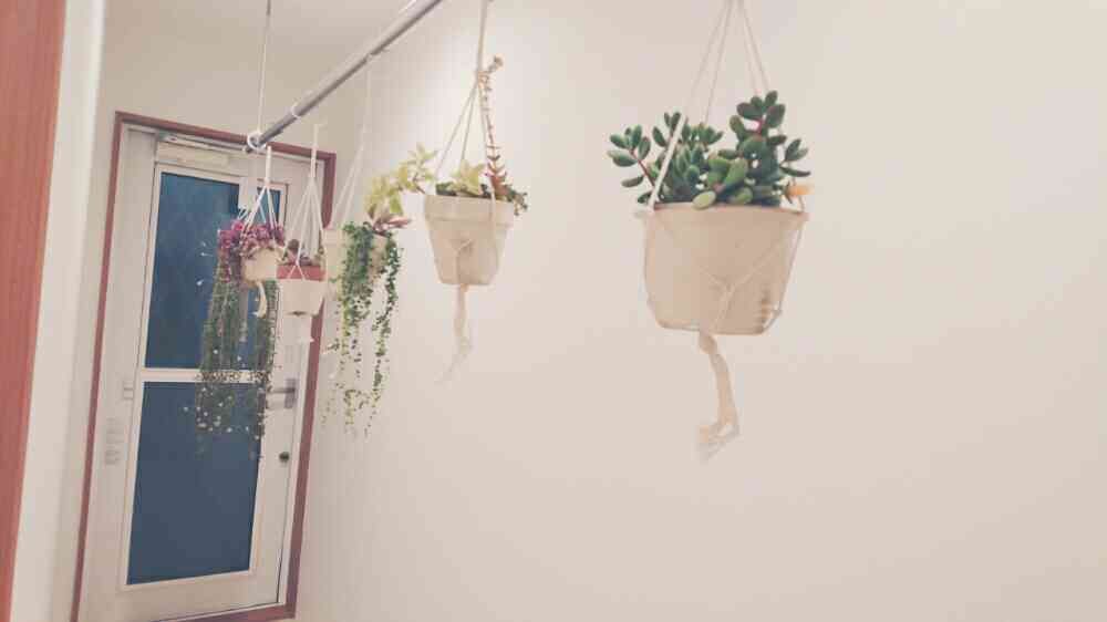 2階の廊下にある物干し竿が寂しそうだったのでせっせと寄せ植えを吊るしました😆