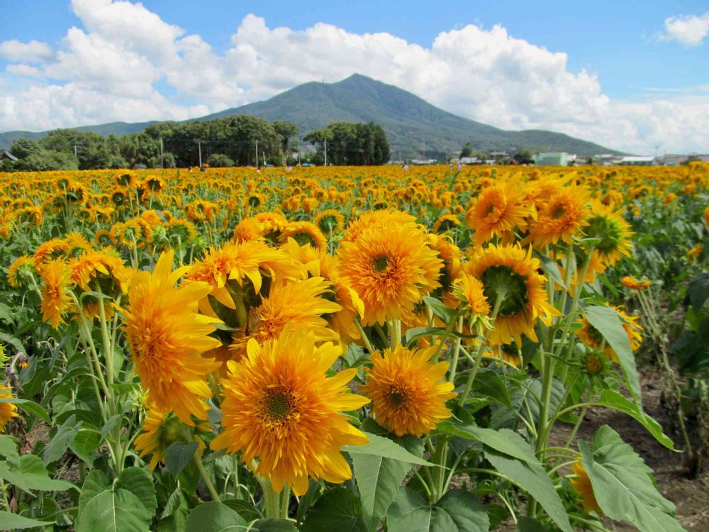 今日の花ヒマワリです。茨城県筑西市にある明野ひまわりの里にて。後ろに見えるのは筑波山です。