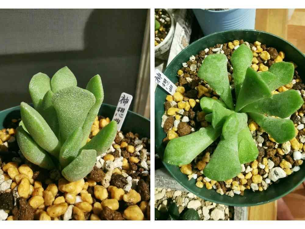 極小プラ鉢から植え替えて一週間。(左は植え替え直後。右は今)