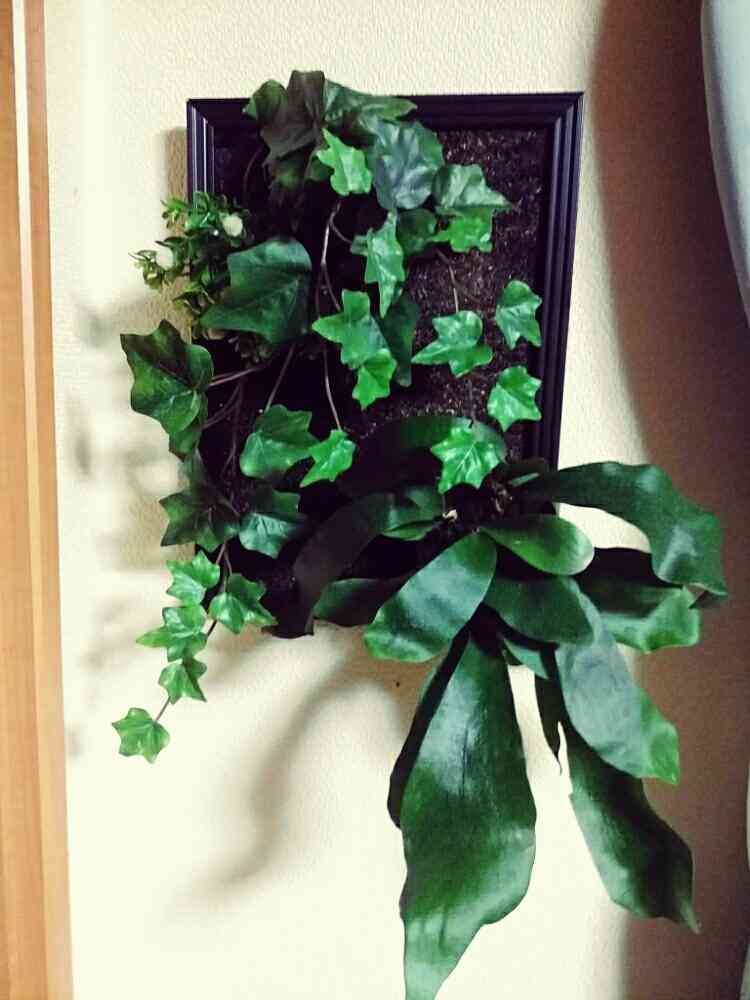 A4フレーム「100均」壁掛けアレンジは、フェイク植物と生コウモリランです。