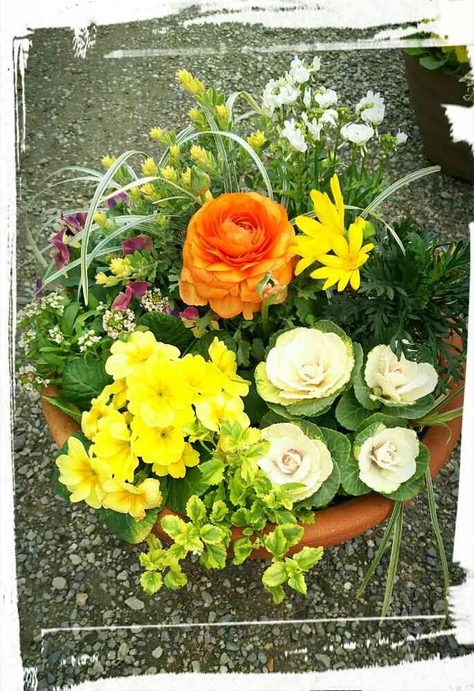 ラナンキュラスと葉牡丹を中心にした寄せ植え🌹 by お店のスタッフさん作🎵