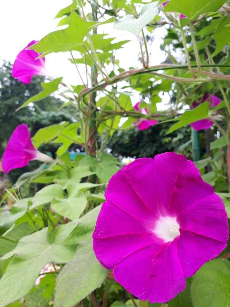 アーリーヘブンリーブルーなどの西洋朝顔は午後まで咲いていますよ。朝起きられない方用に品種改良が進んでいます。