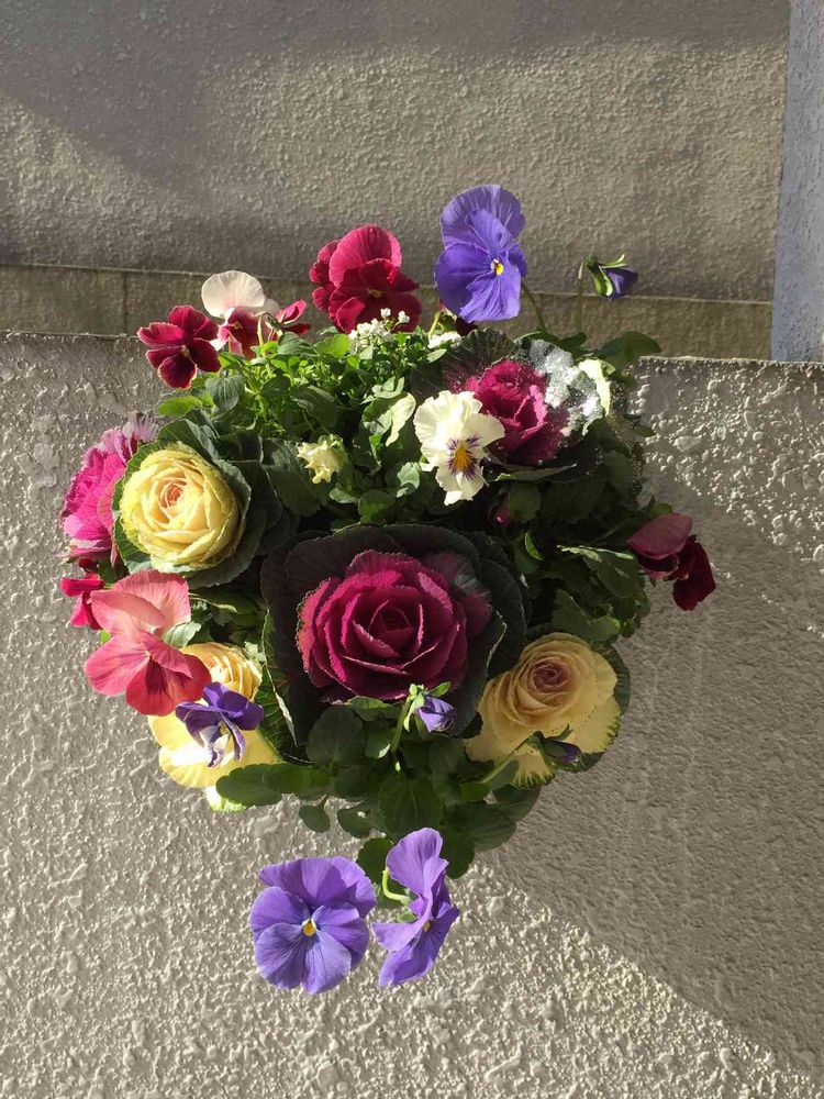 持ち帰って、ちょっとさみしい部分もあったので、キラキラ葉牡丹と白のフリルパンジーを追加しました😊