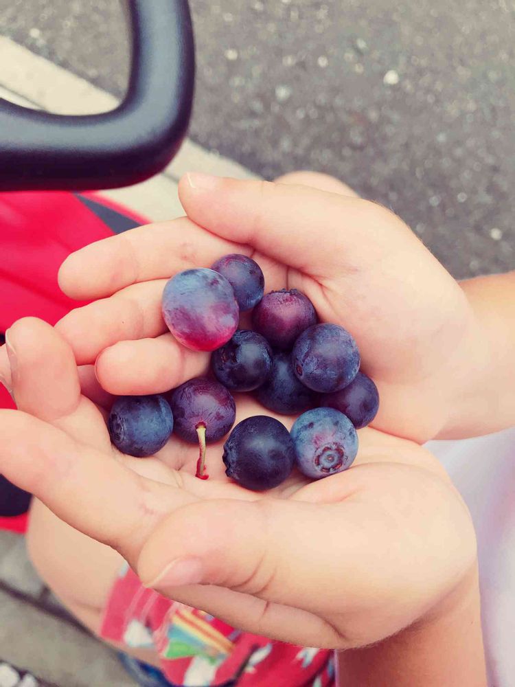 ブルーベリーが色付き、息子が喜んで食べている😊毎年7月の、幸せな光景。