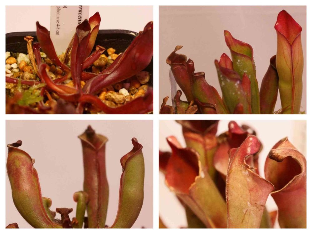 上段左は最近やっと親葉が出始めたサラセニオイデス(H. sarracenioides)、下段右はプルプラセンス(H.purpurascens)。両方ともプタリ テプイ(Ptari Tepui)の同じような場所に生えているそうです。両者は自然交配が進んでいるということで、上段右と下段左はサラセニオイデス×プルプラセンス。上段右はかなりサラセニオイデスに近い雰囲気が出ています。ちなみに上段右の真ん中あたりのピッチャーに白い斑点があるのは病気ではありません、ピッチャから分泌した蜜が固まったものです。