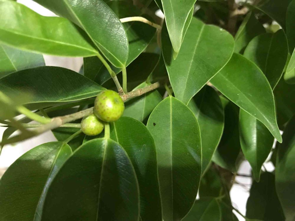 ベンジャミンの実が大きくなってきた。5号サイズであまり大きくない株なんだが結構たくさんついてる。