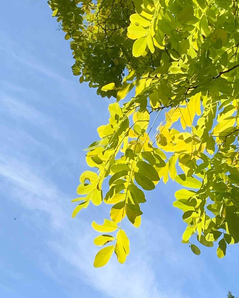 アカシアの木の芽吹いた萌黄色の葉が青空に映えます🌿✨美しい〜🌿💕✨