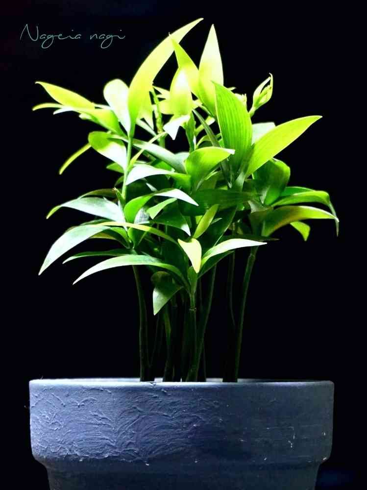 ナギ君、新葉の美しい緑に惹かれて買った。20mの巨木になると言うが、大きな木になるにしては葉の平行脈が不思議…。🍃🌿✨