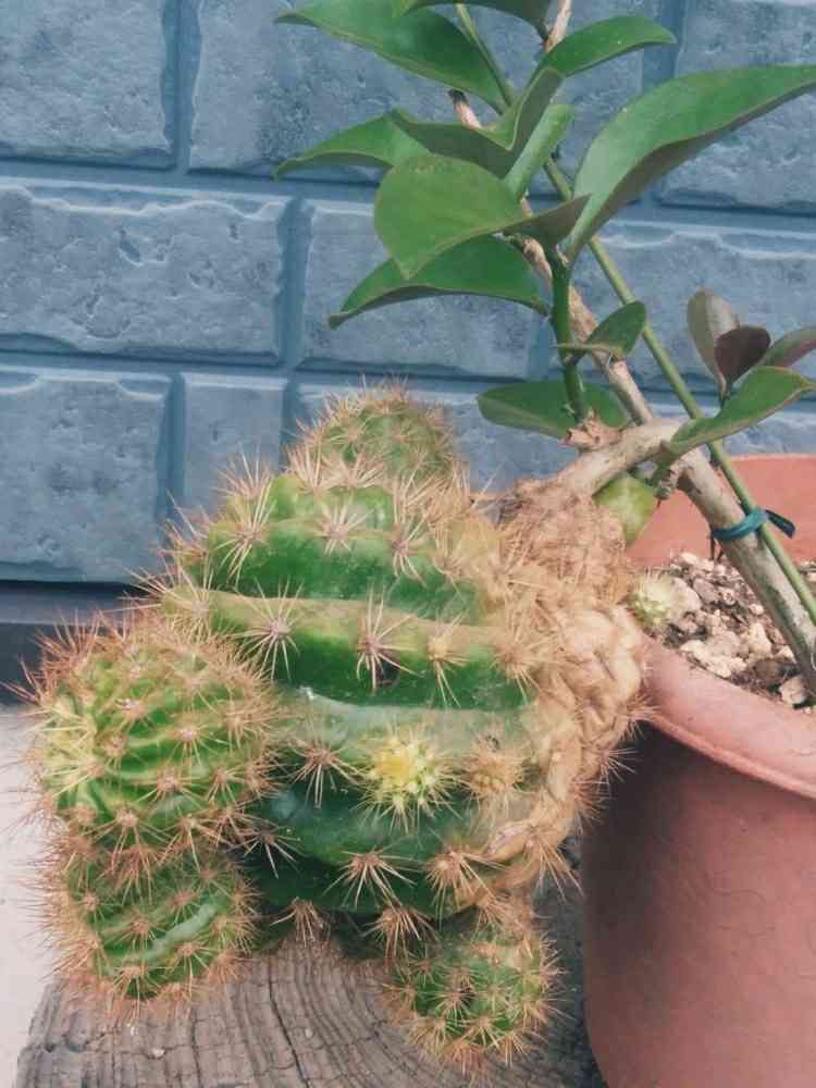 同じサボテン同士なので接ぎ木をして、木の葉サボテンは葉っぱで光合成をしますから成長力旺盛なので栄養を金盛丸に分けてあげられます!