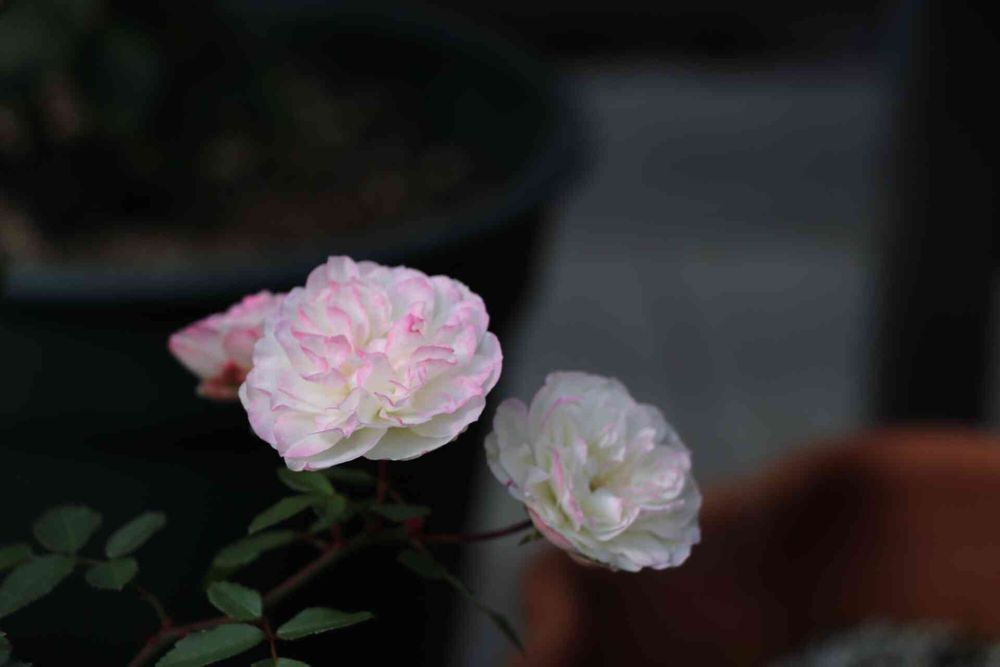 グリーンをおびた白い花が、開花が進むと白になる、ミニバラです。