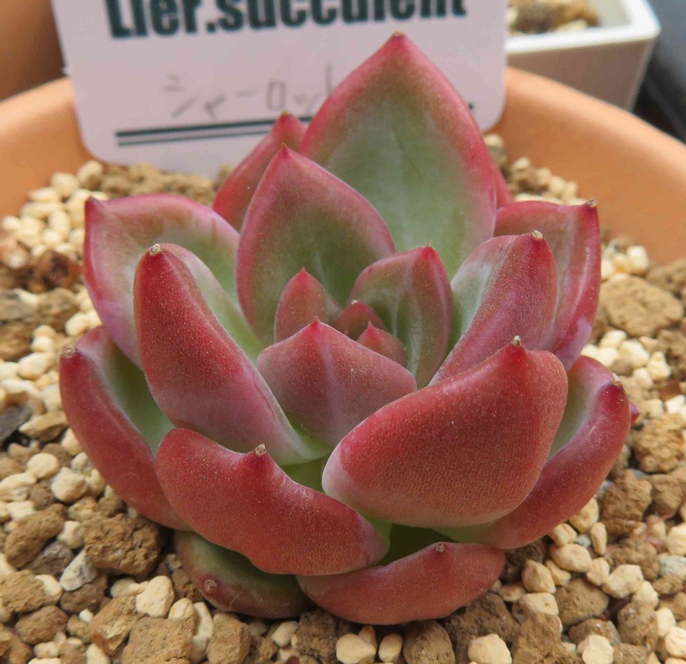 葉の外側があざやかな赤色のシャーロット。春先に比べて色が濃くなった。夏に緑に変わっていくエケベリアがほとんどなのでよけいに目立つ存在。