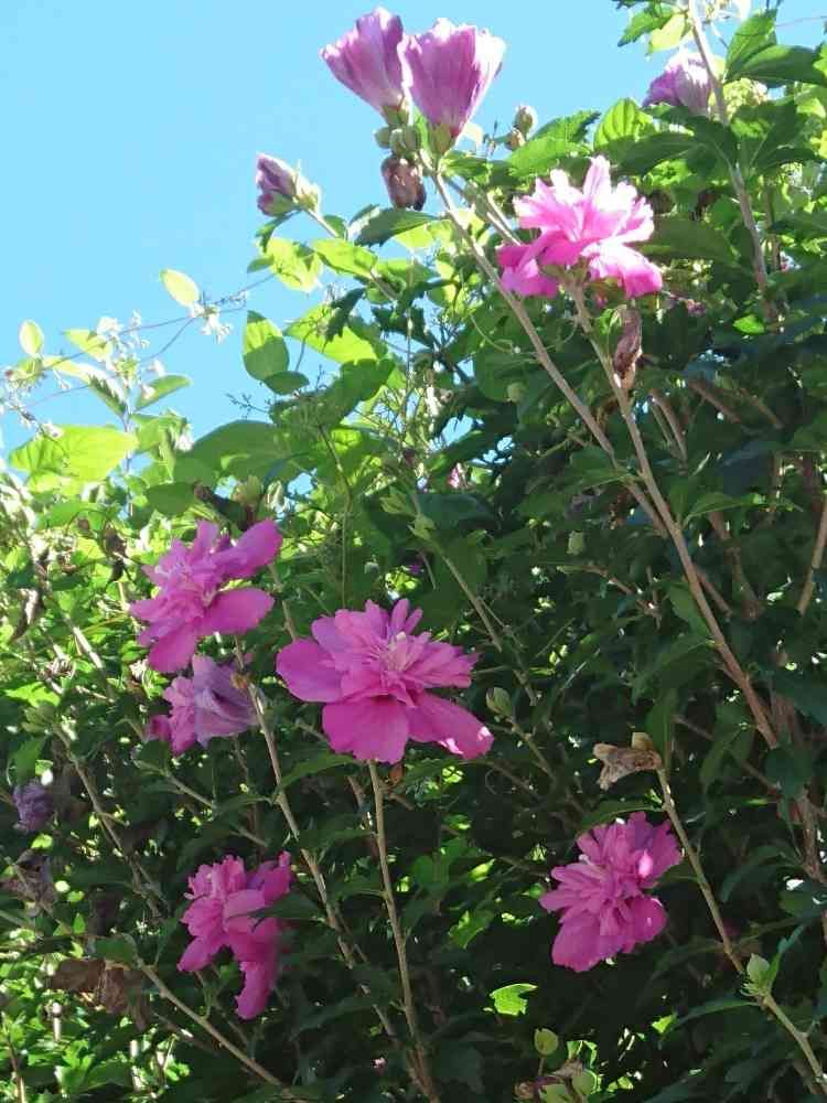 八重咲きのムクゲも青空とコラボレーション。