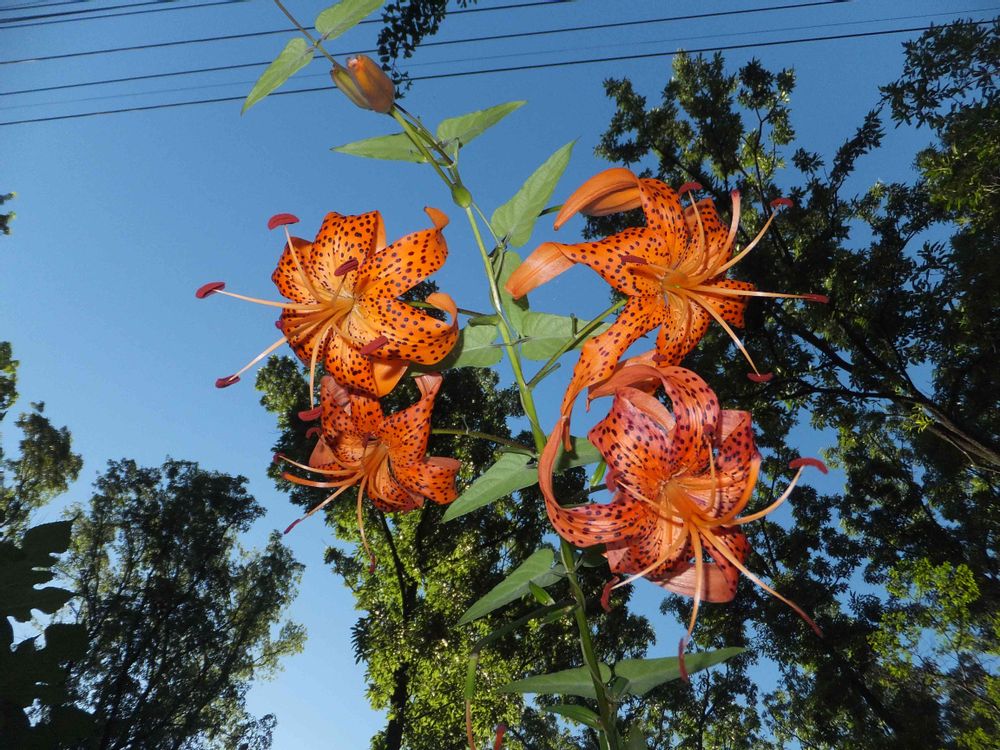 快晴(梅雨明け?)の空に、オニユリを下からフラッシュを焚いて撮りました。