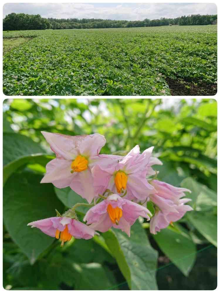 この下のお花はジャガイモのお花です!上の写真は一面のジャガイモ畑。。。品種は多分(北あかり)かな。。。この時期は
