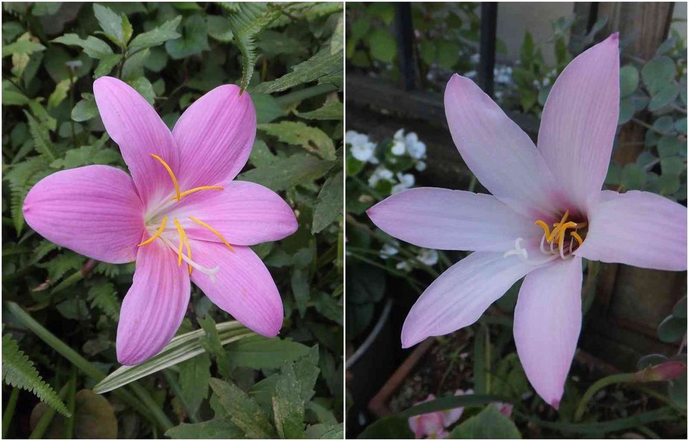 左側か「ゼフィランサス」、右側が「ハブランサス」。 雌しべを比較すると「ハブランサス」は雄カブトムシの角のように跳ね上がっていますが、「ゼフィランサス」は真っすぐです。