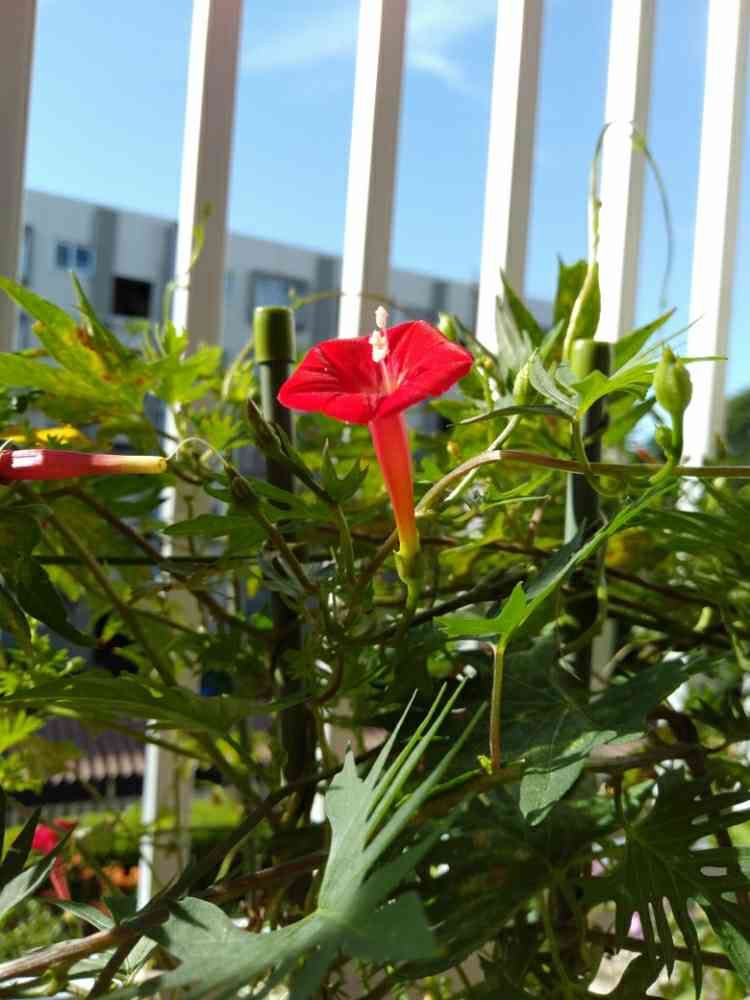 花径2cmほどの小さな赤い花、やっと青空の下で。