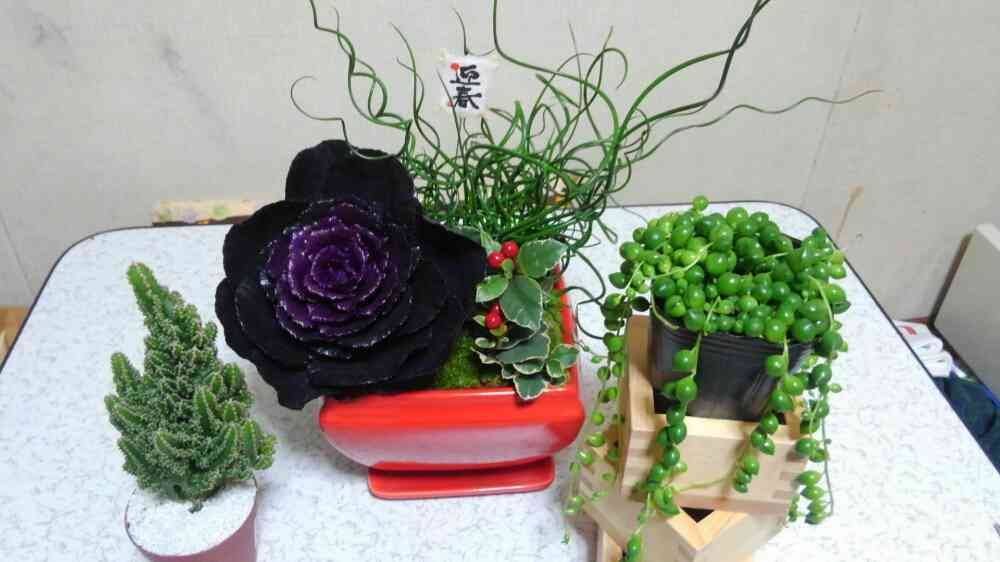 今日は お正月の寄せ植を作りました‼モダンでしょう‼グリーンネックレスと電磁波サボテン🌵連れて帰りました(*^^*)