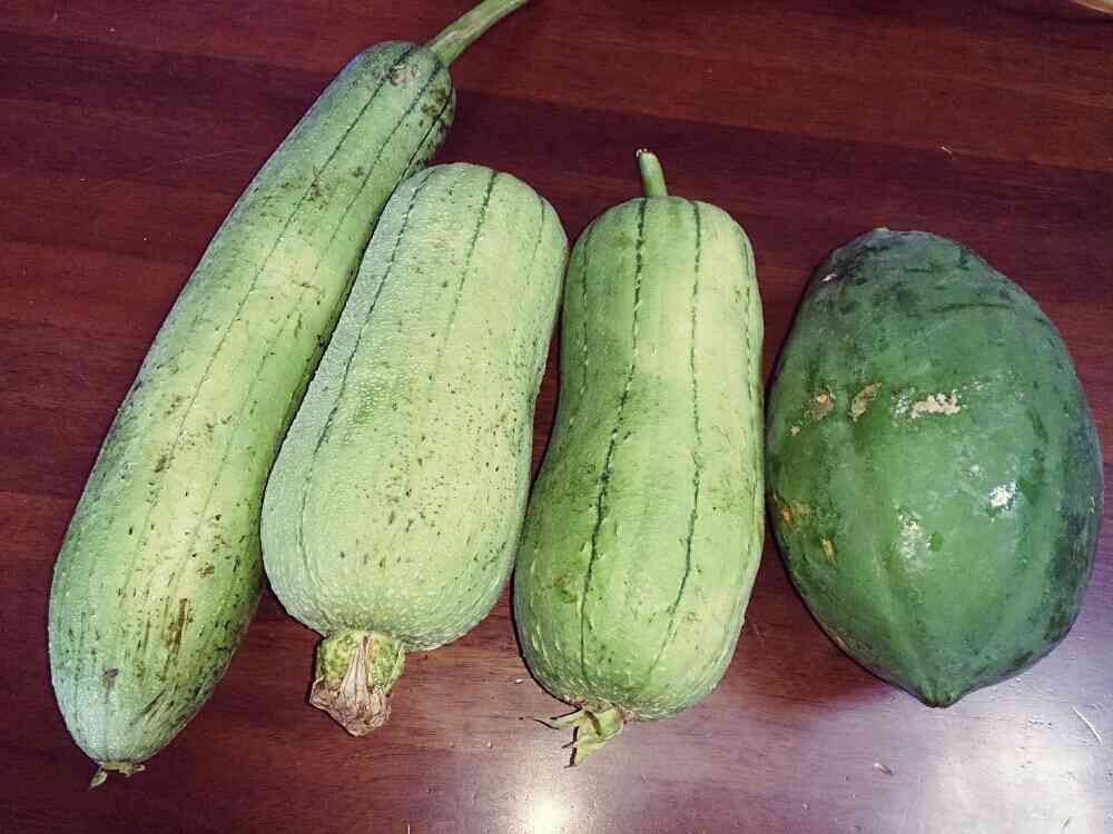 ヘチマ(ナーベーラー)とパパイヤ(パパヤー)です。ヘチマは豆腐と味噌汁に甘味がでます。パパイヤはシリシリーにしました。グリーン繋がりということで。