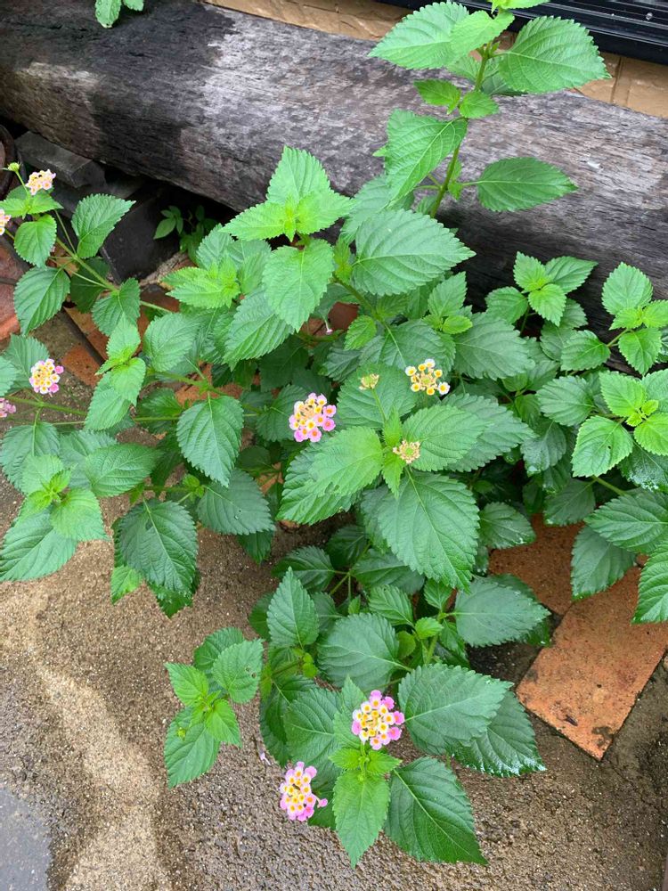 雑草アタックとレンガで塗り固めてるのに、、隙間から「ランタナ」が!