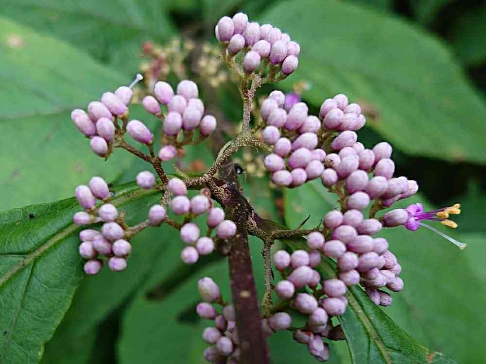 雑木林の庭に自生している3mを超えるムラサキシキブです。都心では1mちょっとの園芸種しか見たことがなかったので、最初はこの大きな木がムラサキシキブだとは思いませんでした。こちらはまだつぼみです。これから花が咲き、秋につける実が楽しみです。