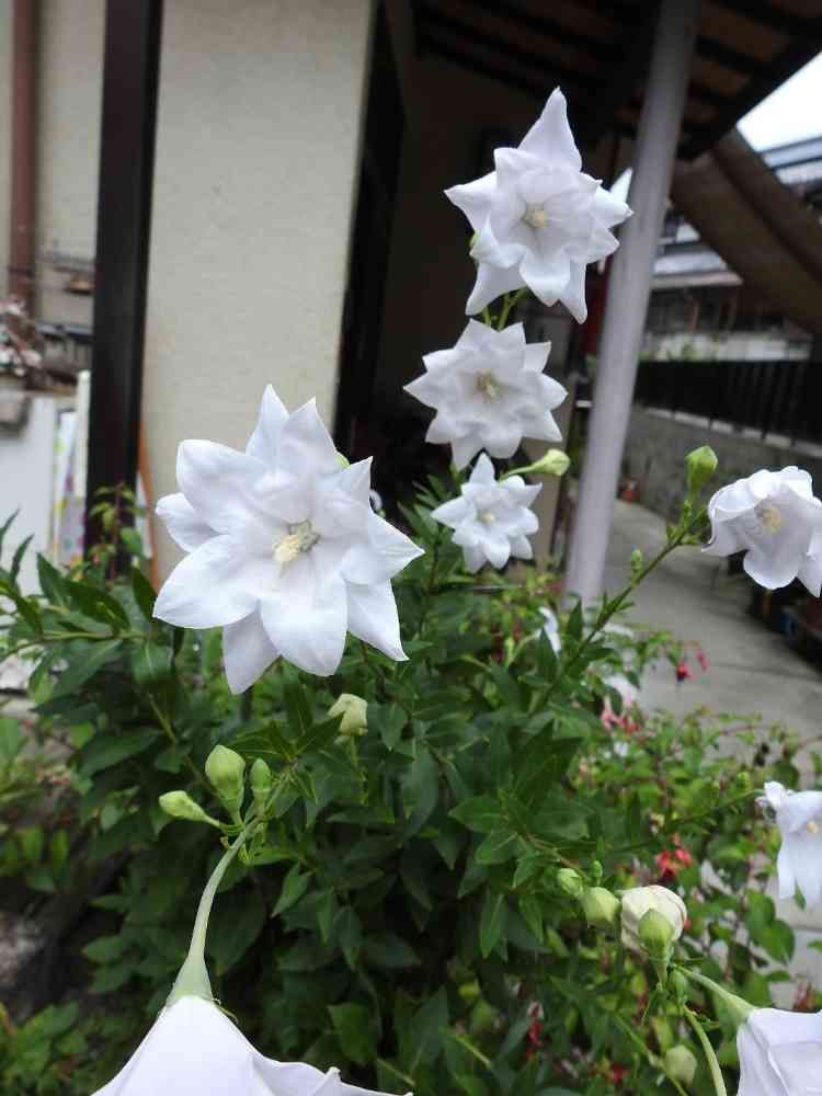 参拝の道すがら民家の軒先で🌸咲く八重咲きの白いキキヨウの花🌸