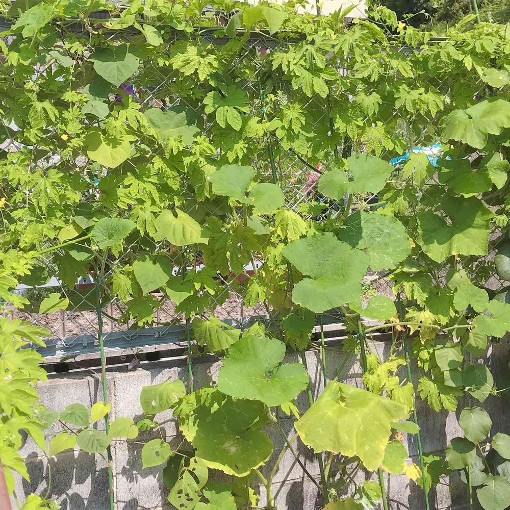 四種の葉っぱが絡み合い、その中を掻き分ける様に、ゴーヤとカボチャが実を付けて😁💦