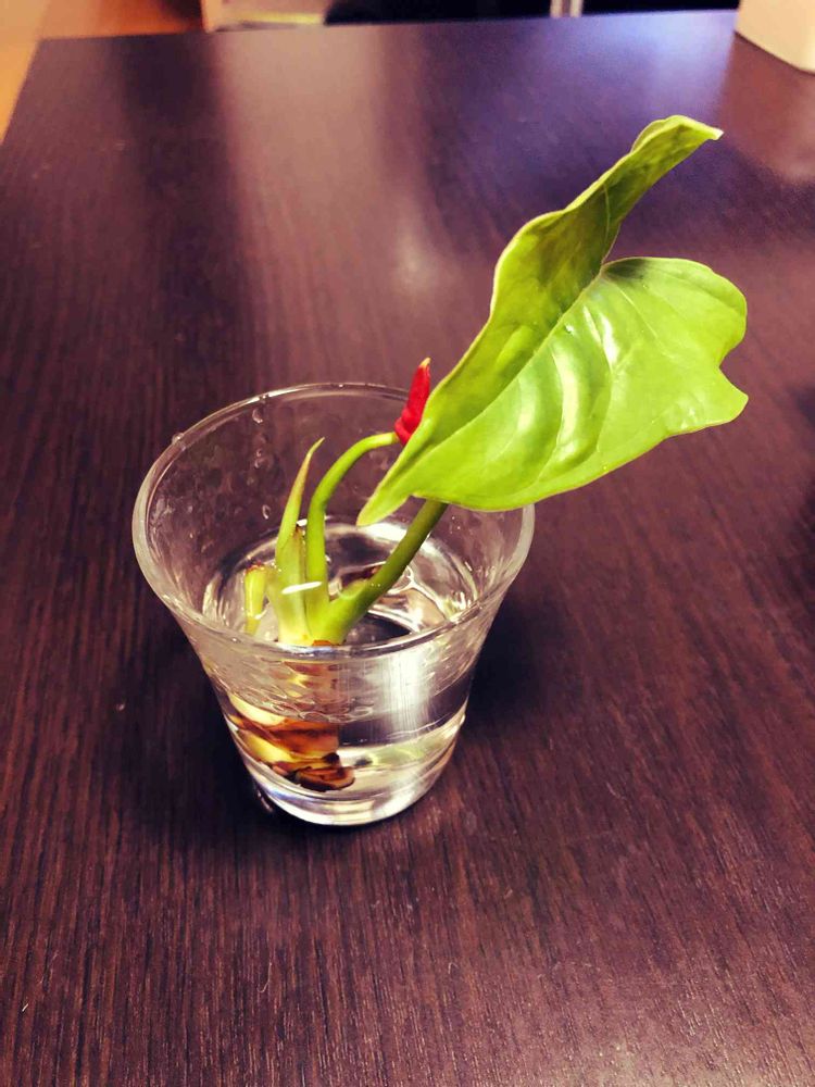 主人の職場に、誰もお世話をしていないカラッカラのアンスリウムがあると聞いて、傷んだ部分を切ったあとに持ち帰って来てもらい、我が家で面倒を見ることにしました🥰