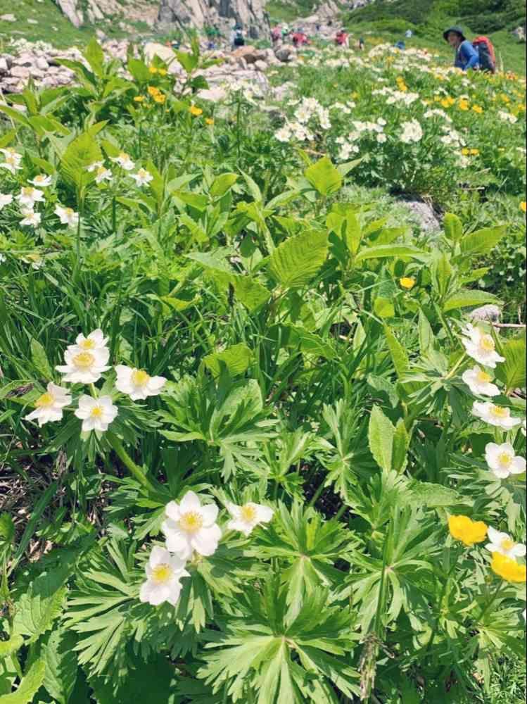ハクサンイチゲ、ミヤマキンポウゲ、シナノキンバイ、ミヤマキンバイなど花いっぱいのお花畑です。