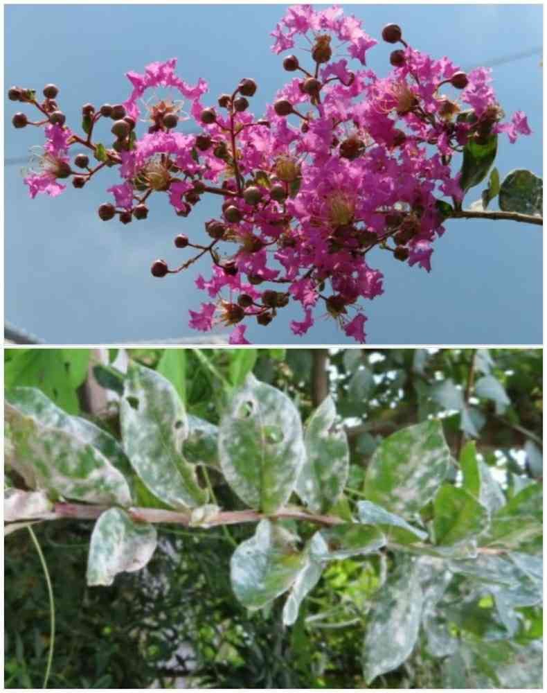 ⬇️サルスベリの葉、今年はかなり木酢液を散布したのですがうどん粉病に…