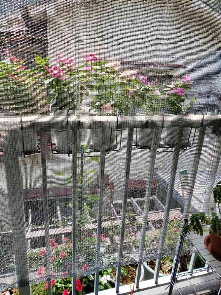 投稿写真は、遮光率45%の日除けシートの向こうに見えるニチニチソウです。花がら摘みと種取り、過湿による病気対策が多いので大変です。