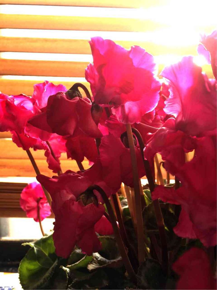 おはようございます🌞朝陽が差し込む窓辺で燃え上がる様な赤い色したシクラメン。